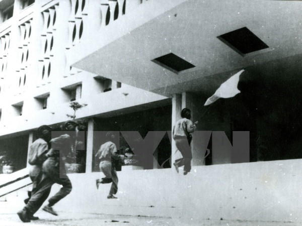 Bỗng chốc, cổng Dinh bị húc đổ, đoàn tăng cày lên thảm đỏ, tiến thẳng đến thềm Dinh. Tôi và anh Huỳnh Văn Tòng giúp người bộ đội xe tăng cầm cờ giải phóng treo lên nóc Dinh.