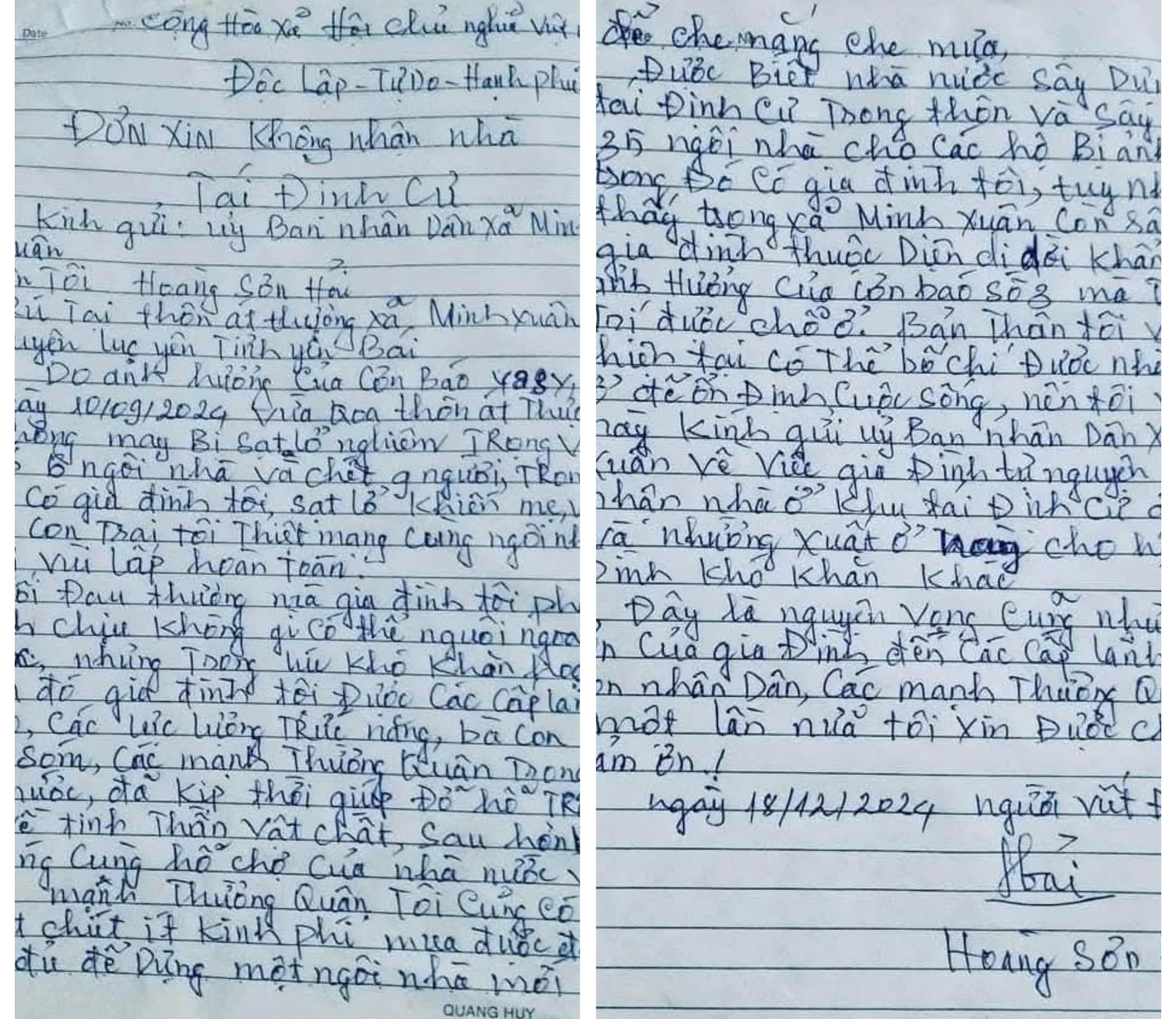 "Khi đặt bút viết đơn xin không nhận nhà tái định cư, tôi chỉ nghĩ trên địa bàn còn nhiều hoàn cảnh khó khăn hơn, gia đình đã có sự giúp đỡ đủ để xây dựng được nhà mới nên xin nhường lại cho họ", ông Hải bộc bạch.