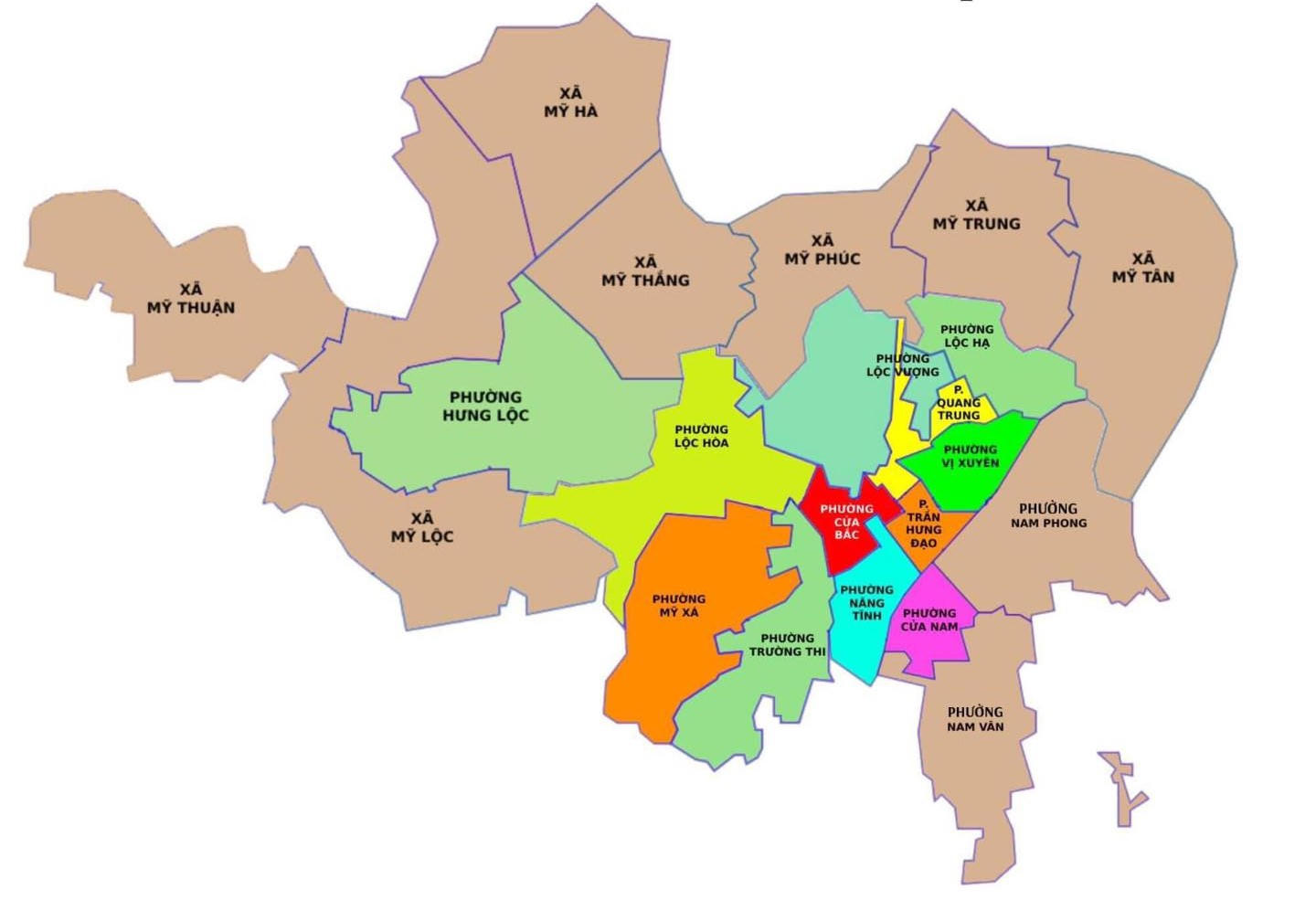 Thành phố Nam Định sẽ có 21 đơn vị hành chính cấp xã, gồm 14 phường: Cửa Bắc, Cửa Nam, Hưng Lộc, Lộc Hạ, Lộc Hòa, Lộc Vượng, Nam Phong, Nam Vân, Năng Tĩnh, Mỹ Xá, Quang Trung, Trần Hưng Đạo, Trường Thi, Vị Xuyên và 7 xã: Mỹ Hà, Mỹ Lộc, Mỹ Phúc, Mỹ Tân, Mỹ Thắng, Mỹ Thuận, Mỹ Trung.