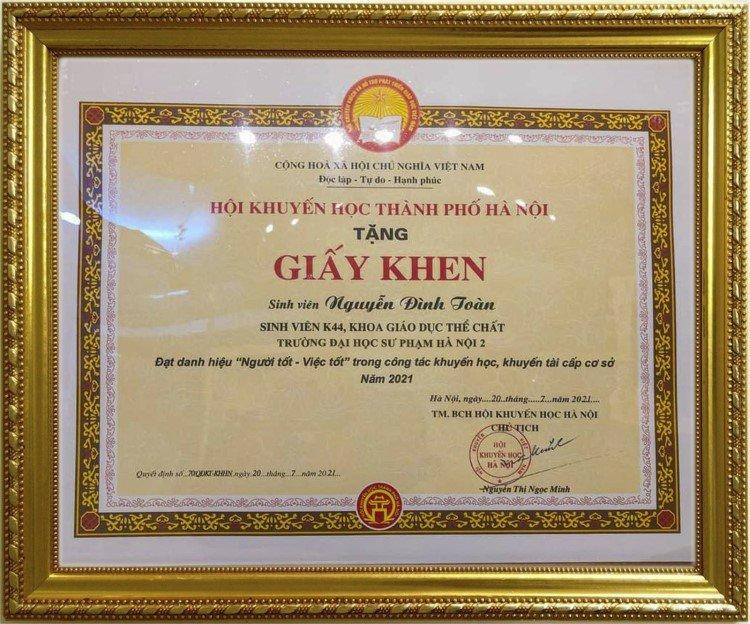 (PLVN) - Sinh viên năm thứ tư Khoa Giáo dục thể chất, Trường ĐHSP Hà Nội 2, Nguyễn Đình Toàn vừa được Hội Khuyến học Thành phố Hà Nội vinh danh trong Hội nghị biểu dương “Người tốt - Việc tốt” trong công tác khuyến học, khuyến tài năm 2021.