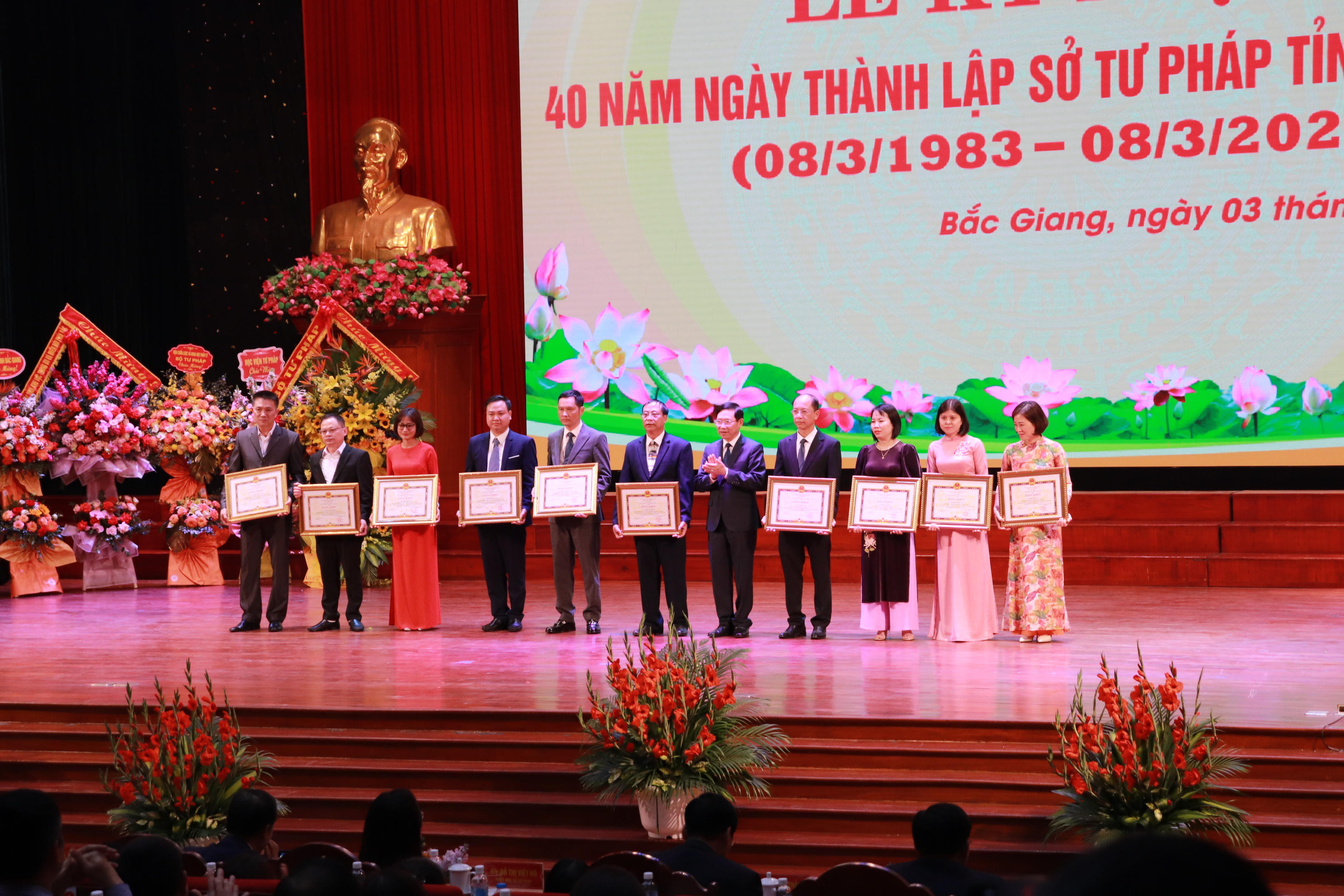 Nhân dịp này, Hội nghị đã trao tặng Bằng khen của Thủ tướng Chính phủ cho tập thể Sở Tư pháp Bắc Giang; trao tặng Kỷ niệm chương Vì sự nghiệp Tư pháp, Bằng khen Bộ trưởng Bộ Tư pháp, Bằng khen của Chủ tịch UBND tỉnh Bắc Giang, Giấy khen của Giám đốc Sở Tư pháp Bắc Giang cho các tập thể, cá nhân có thành tích xuất sắc.