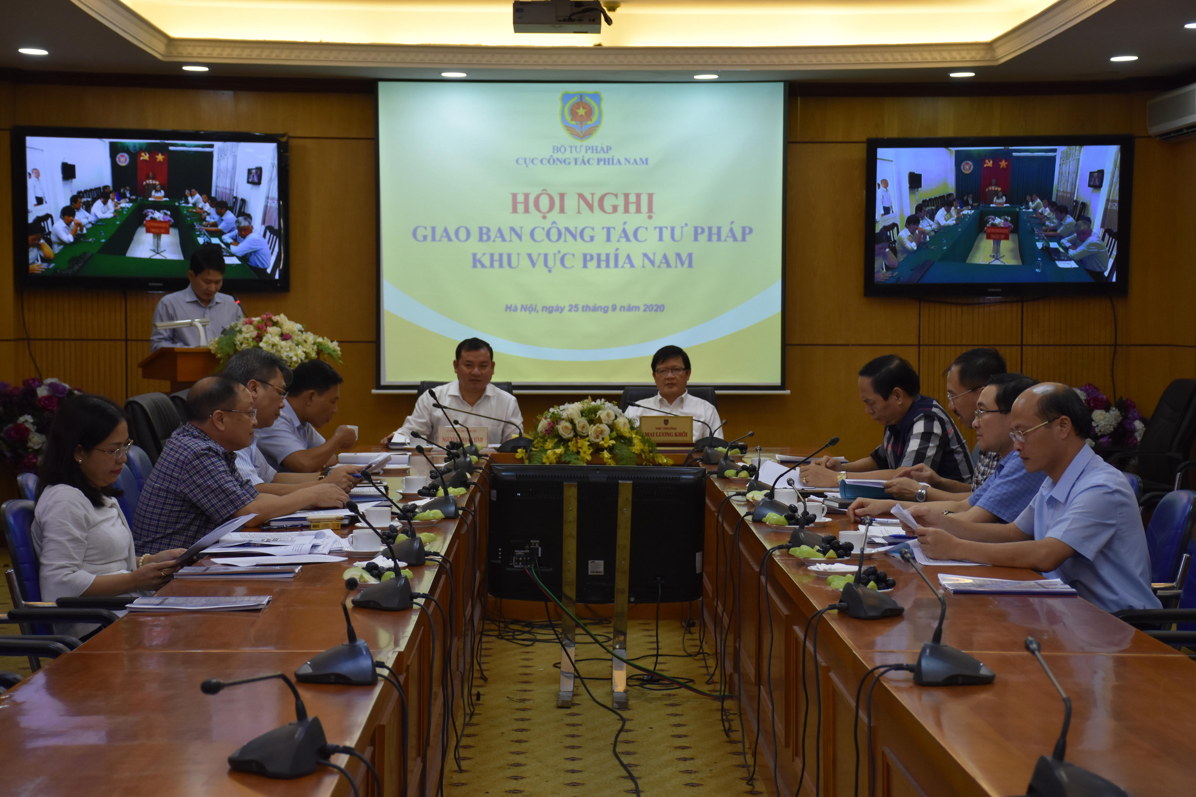 Theo báo cáo tại cuộc họp, trước tình hình diễn biến phức tạp của dịch bệnh Covid-19, thực hiện chỉ đạo của Chính phủ, Thủ tướng Chính phủ và UBND các tỉnh, thành phố, các Sở Tư pháp trong khu vực đã phổ biến, quán triệt đến công chức, viên chức và người lao động tại đơn vị thực hiện tốt các biện pháp phòng, chống dịch bệnh tại cơ quan và nơi cư trú. Thực hiện biện pháp giãn cách xã hội, đẩy mạnh ứng dụng công nghệ thông tin để giải quyết công việc. Công tác tư pháp tại các địa phương trong khu vực phía Nam trong 9 tháng đầu năm 2020 đã bám sát 9 nhóm nhiệm vụ trọng tâm, triển khai cơ bản toàn diện, có trọng tâm, trọng điểm các nhiệm vụ được giao theo kết luận của Phó Thủ tướng Thường trực Chính phủ Trương Hòa Bình và Thông báo kết luận của Bộ trưởng Lê Thành Long tại Hội nghị toàn quốc triển khai công tác tư pháp năm 2020.