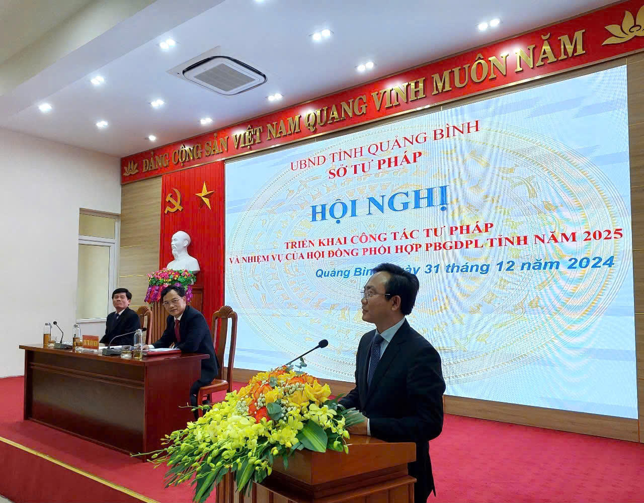 Chiều 31/12, Sở Tư pháp Quảng Bình tổ chức hội nghị tổng kết công tác tư pháp, Hội đồng Phối hợp phổ biến giáo dục pháp luật (PBGDPL) tỉnh năm 2024, triển khai nhiệm vụ năm 2025. Ông Hoàng Xuân Tân, Phó Chủ tịch UBND tỉnh, Chủ tịch Hội đồng Phối hợp PBGDPL tỉnh, dự và phát biểu chỉ đạo.