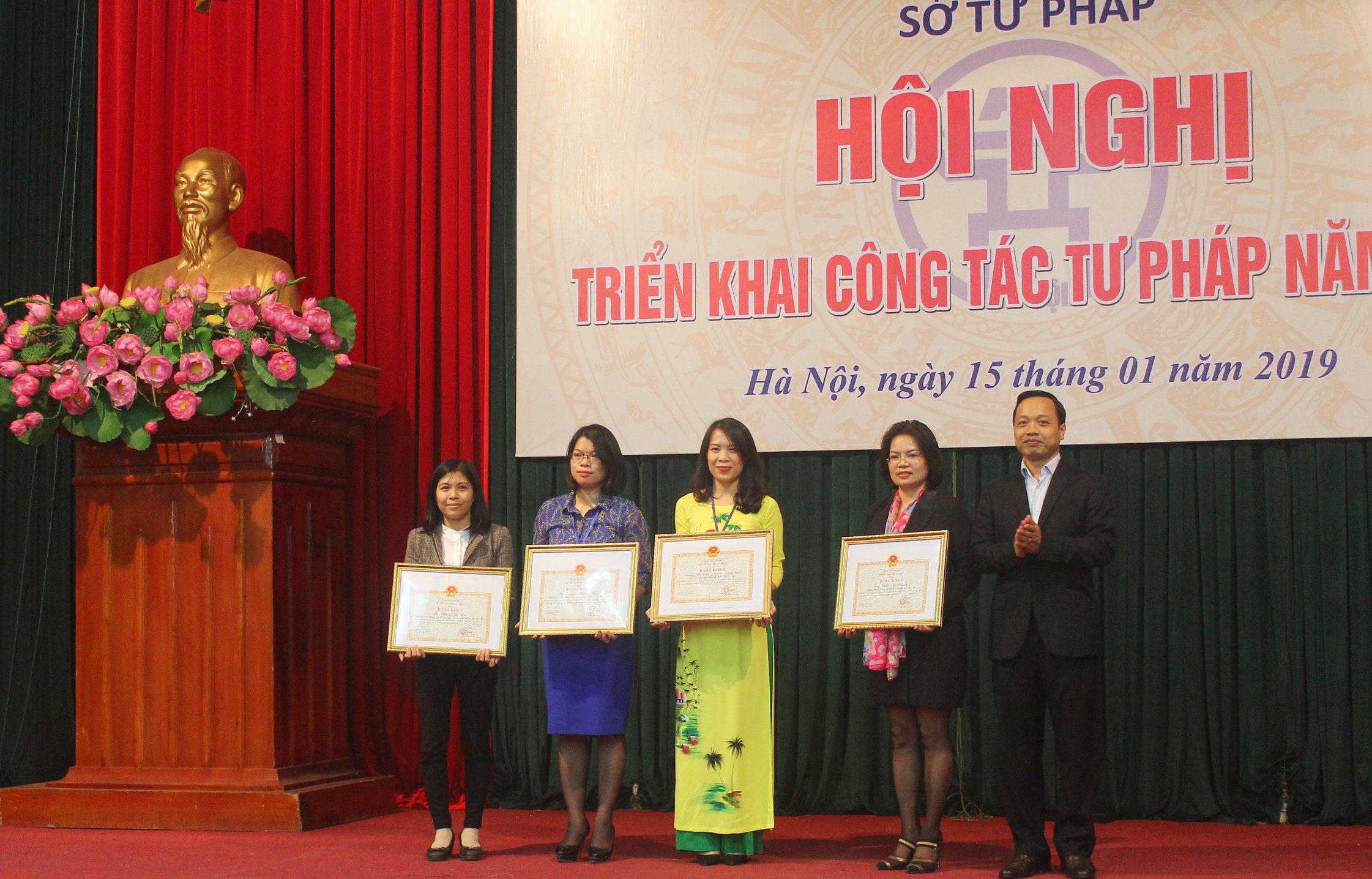 Nhân dịp này, Hội nghị đã trao tặng Cờ thi đua Ngành Tư pháp cho Sở Tư pháp Hà Nội, tặng Bằng khen của Bộ trưởng Bộ Tư pháp cho 1 tập thể và 3 cá nhân có thành tích xuất sắc trong công tác tư pháp năm 2018; Bằng khen của Chủ tịch UBND TP cho Sở Tư pháp Hà Nội vì đã hoàn thành xuất sắc nhiệm vụ năm 2018, tặng Cờ thi đua của UBND TP Hà Nội cho 5 tập thể đạt kết quả xuất sắc trong phong trào thi đua cùng nhiều danh hiệu khác.