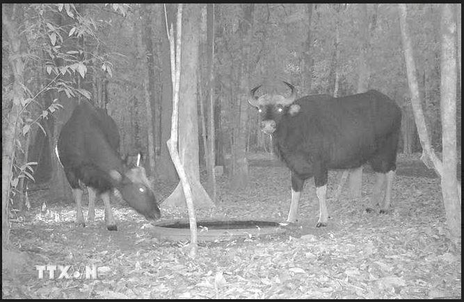 Hai cá thể bò tót đến uống nước tại một điểm tiếp nước trong rừng được Khu Bảo tồn Thiên nhiên Văn hóa Đồng Nai ghi nhận bằng công nghệ “bẫy ảnh.” (Ảnh: TTXVN). |