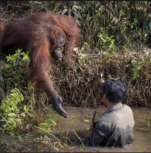 Cách đây mấy năm, cộng đồng mạng thế giới đã từng rưng rưng cảm xúc khi xuất hiện tấm ảnh của một nhiếp ảnh gia nghiệp dư đã chộp được khoảnh khắc con đười ươi chìa tay như để ngỏ ý giúp đỡ một người đàn ông đang ở dưới vũng lầy có rắn độc.