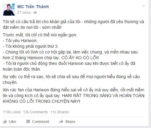 Nửa đêm 3/2, nam MC Trấn Thành đăng đàn trên trang cá nhân khẳng định, mối tình giữa anh với Hari Won là có thật. Theo đó, anh thừa nhận mình yêu Hari Won và không phải là kẻ thứ 3 chen vào khiến tình yêu 9 năm của Hari và Tiến Đạt phải tan vỡ.
