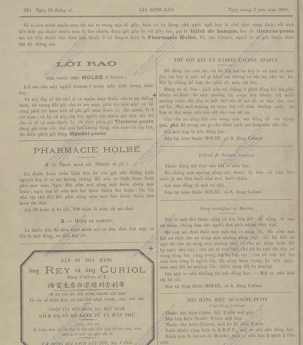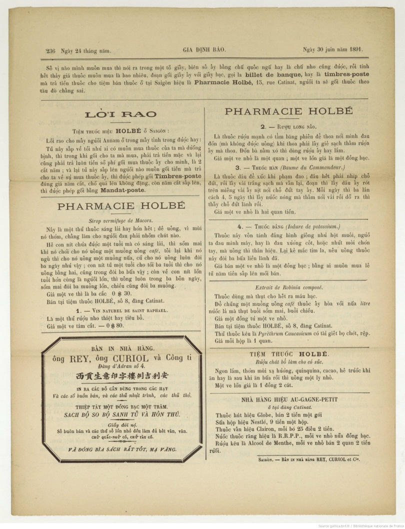 Quảng cáo trên tờ Gia định báo. (Nguồn ảnh: Trung tâm Lưu trữ quốc gia). |