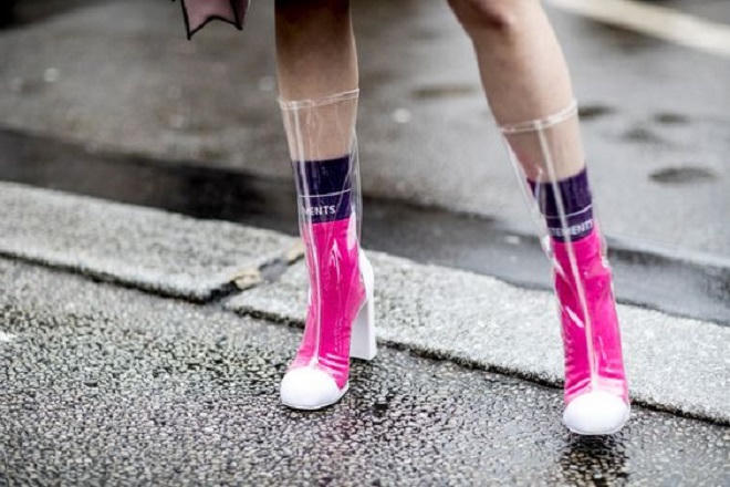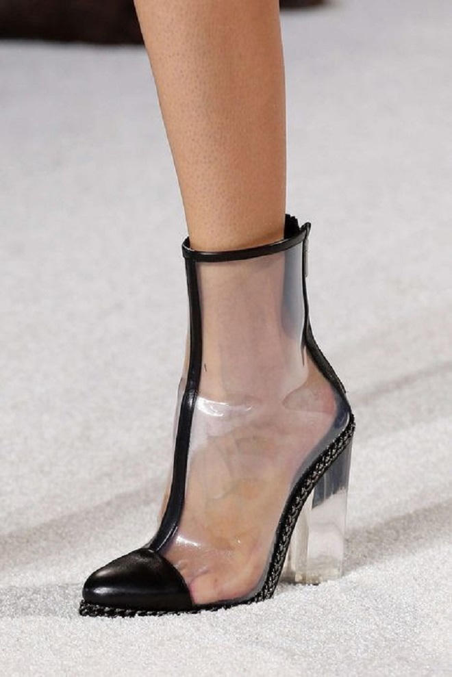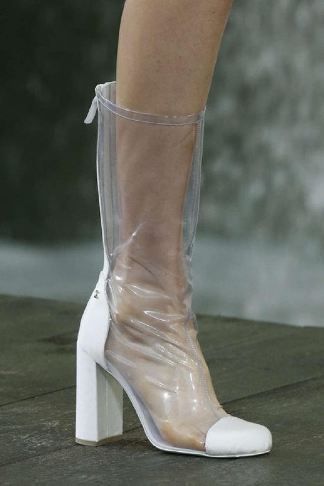 Thời trang Xuân Hè 2018 trên các sàn diễn thời trang nổi tiếng thế giới nổi bật với những mẫu thiết kế xuyên thấu. Xu hướng xuyên thấu giờ đây xâm lấn sang cả phụ kiện. Nhìn vào những đôi giày này, giới mộ điệu nghĩ tới những đôi giày đi mưa bằng chất liệu nylon. Ý đồ của các nhà thiết kế là tạo ra thời trang cao cấp từ chất liệu nylon, vốn chỉ dành cho đồ dùng hàng ngày.