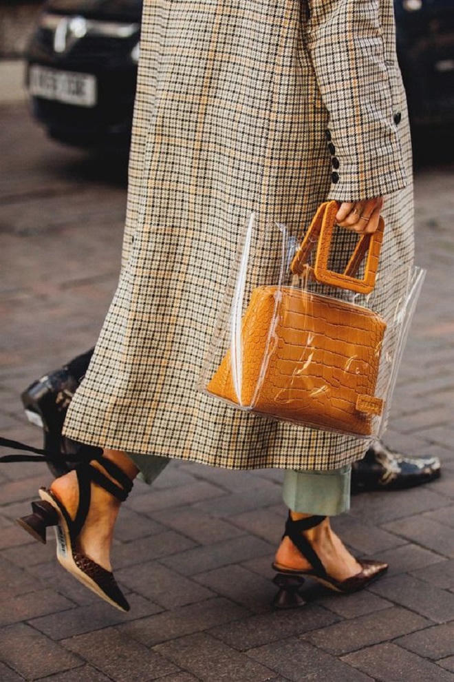Không chỉ giày, túi xách trong suốt cũng lên ngôi. Các nhà thiết kế bắt đầu ứng dựng chất liệu xuyên thấu này cho túi xách từ trước khi những đôi boots nylon ra đời từ rất lâu. Khác với giày, túi xách nhựa trong tượng trưng cho ý nghĩa bảo vệ môi trường, khi tái sử dụng polyester để làm thành những món đồ xinh đẹp.