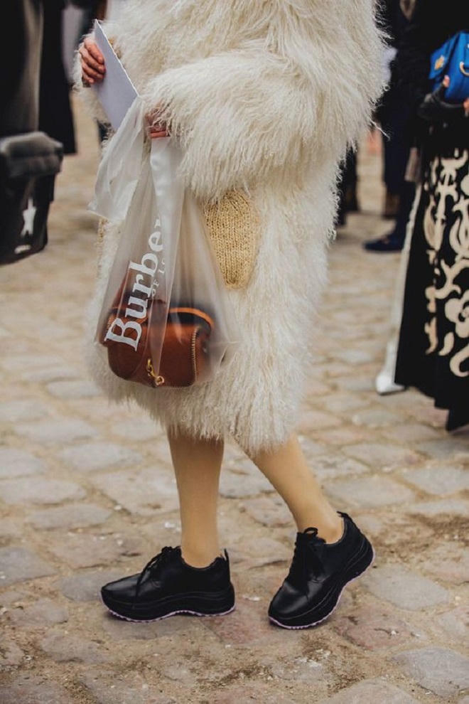 Mùa Xuân Hè năm nay, nhà Burberry còn ra mắt hẳn kiểu túi xách đặt trong "túi đi chợ" với logo của nhãn in to. Nếu không có sự quảng bá rầm rộ, được lăng xê từ các fashionista và logo bên trên, tín đồ dễ nhầm lẫn đây chỉ là một chiếc túi nylon mua từ khu chợ nào đó.