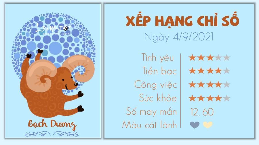 Tiếp nối tử vi ngày 3/9/2021, thời điểm Mặt Trăng tạo thành góc 90 độ với sao Thiên Vương, Bạch Dương là một người rất thông minh và nhanh trí. Bạn có thể đưa ra nhiều ý tưởng mới mẻ, giúp mọi việc tiến triển thuận lợi hơn rất nhiều.
