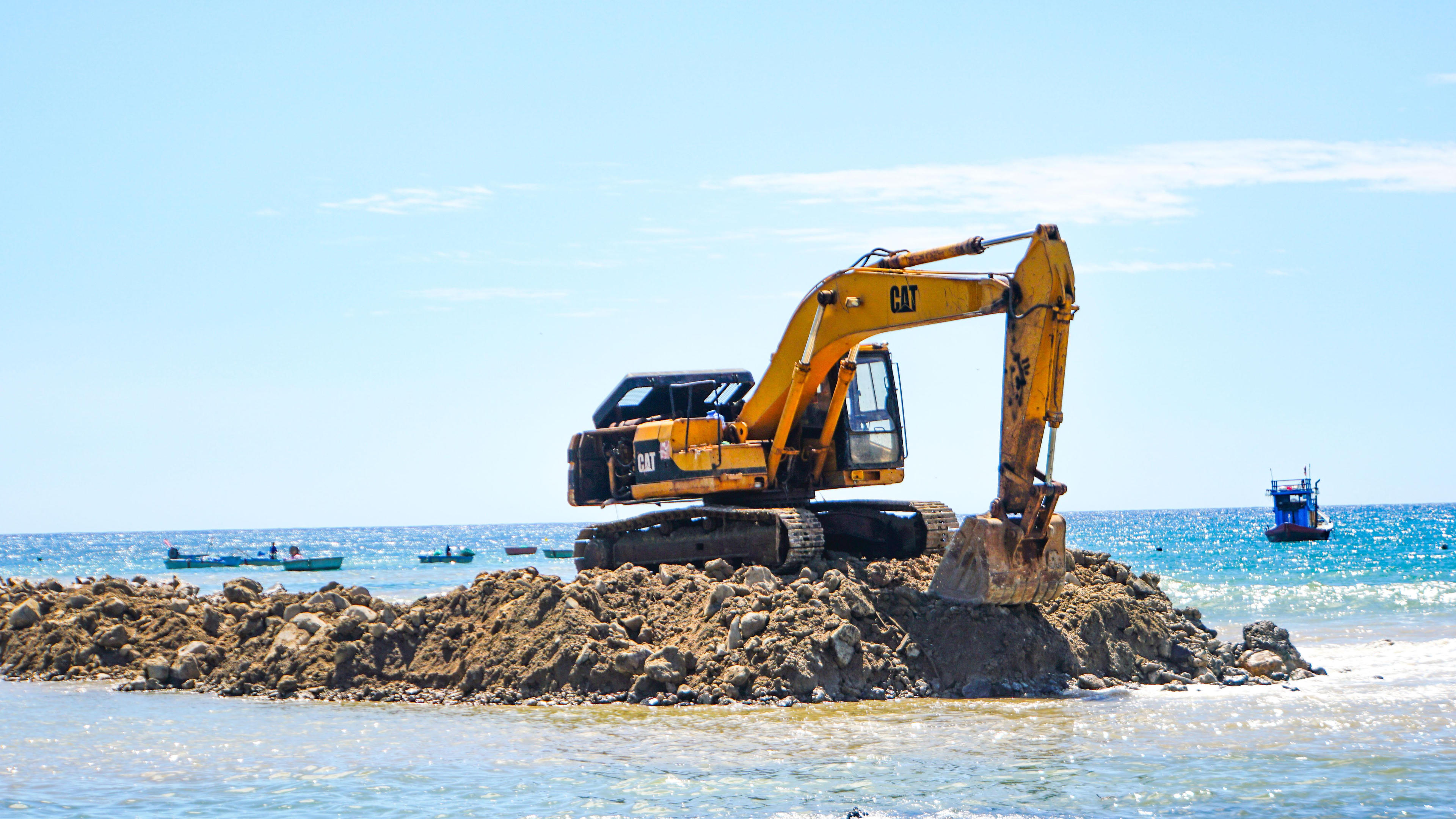 Khi phóng viên tìm đến gành đá nhảy thuộc thôn An Cường, xã Bình Hải (huyện Bình Sơn, Quảng Ngãi), đập ngay vào mắt chúng tôi là chiếc xe máy đào đang đứng trên một bờ chắn cách mặt nước biển cao tầm 2 mét, dài khoảng gần 70 mét nằm cách bờ chừng 40 mét.