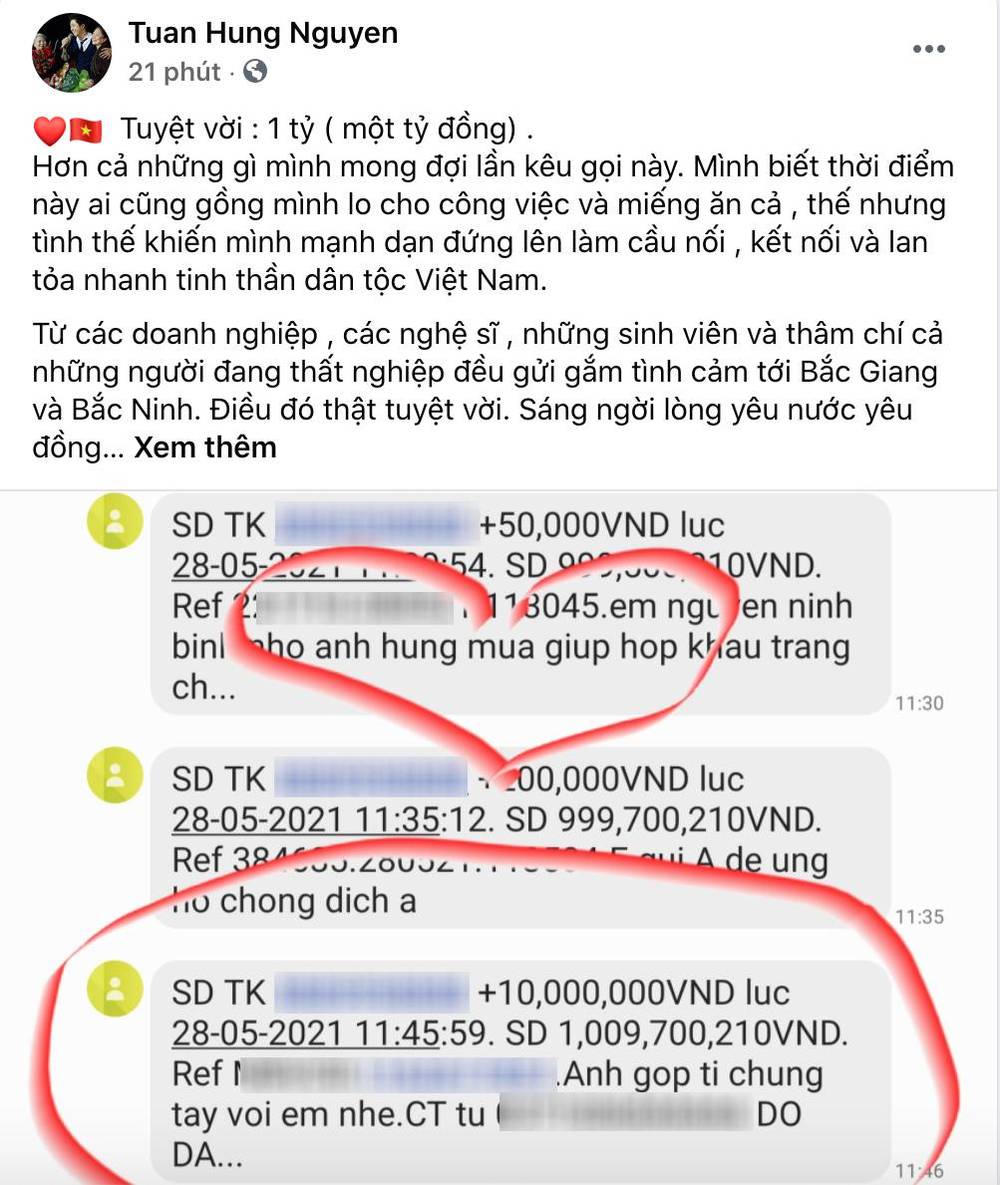 Mới đây trên trang cá nhân, ca sĩ Tuấn Hưng thông báo số tiền mà anh đứng ra kêu gọi khán giả đóng góp để giúp bà con Bắc Ninh, Bắc Giang chống dịch đã lên tới hơn 1 tỷ đồng.