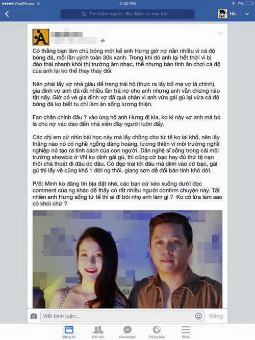 Mới đây, một tài khoản Facebook đã lý giải những status buồn bã của vợ chồng Tuấn Hưng. Người này hé lộ, huấn luyện viên The Voice đang nợ nần nhiều vì cá độ bóng đá, 'mỗi lần uýnh toàn 30k xanh'. (30.000 USD). Anh kết hôn với Thu Hương vì bố mẹ cô giàu có, giúp anh trang trải nợ nần. "Gia đình vợ anh đã rất nhiều lần trả nợ cho anh nhưng anh vẫn chứng nào tật nấy. Giờ có vẻ gia đình vợ đã quá chán vì anh vừa gái gú vừa cá độ bóng đá, không biết tu chí làm ăn sống lương thiện". Người này còn khẳng định, thông tin họ chia sẻ không bịa đặt.