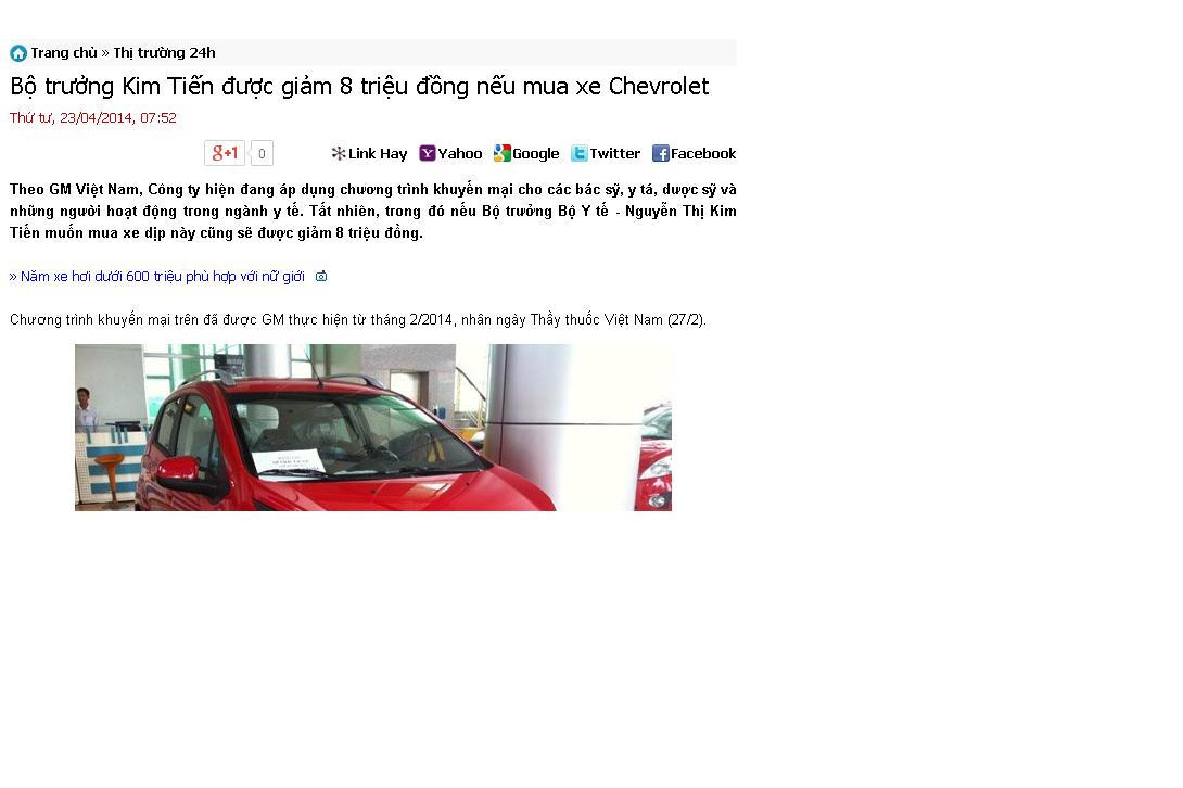 Cũng theo nội dung bài báo thì chương trình khuyến mại đặc biệt nói trên đã được GM thực hiện từ tháng 2/2014, nhân ngày Thầy thuốc Việt Nam (27/2) và sẽ kéo dài đến tháng 6/2014.