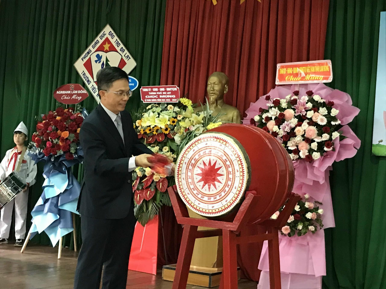 Ông Đặng Trí Dũng - UVBTV Tỉnh uỷ, Bí thư Thành uỷ Đà Lạt đánh trống khai giảng tại trường Tiểu học Thái Phiên (TP Đà Lạt). |