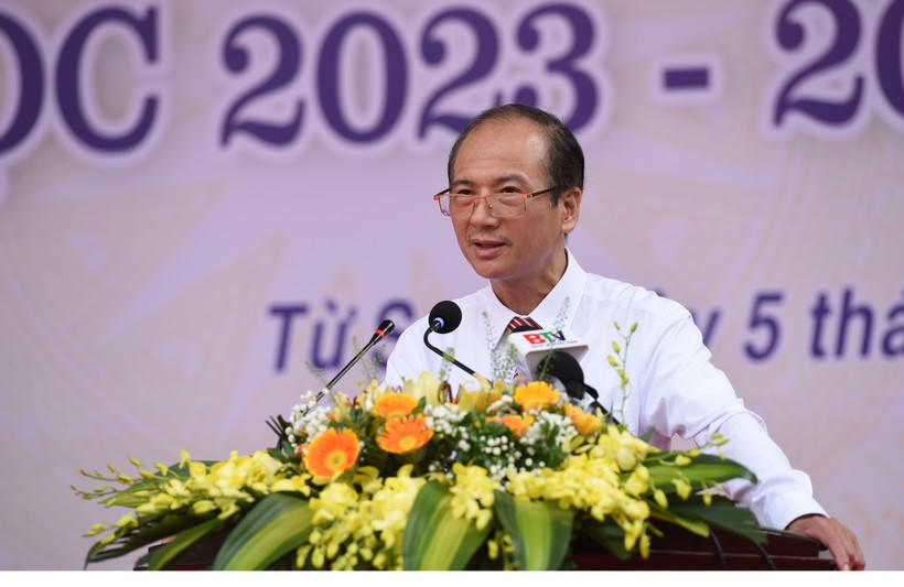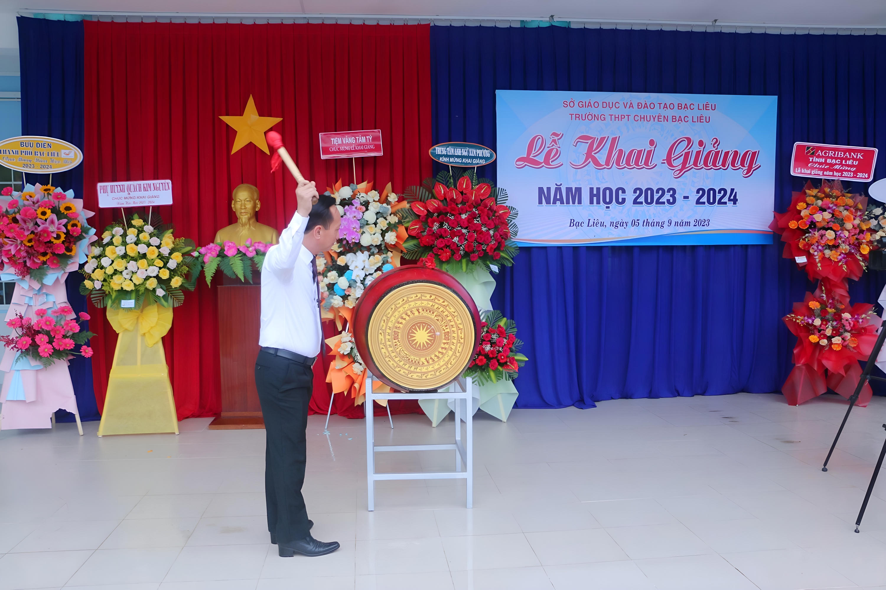 Bí thư Tỉnh ủy Bùi Minh Châu đã đánh trống khai giảng năm học 2023-2024 và tặng hoa chúc mừng những thành tích mà thầy và trò nhà trường đạt được trong năm học vừa qua.