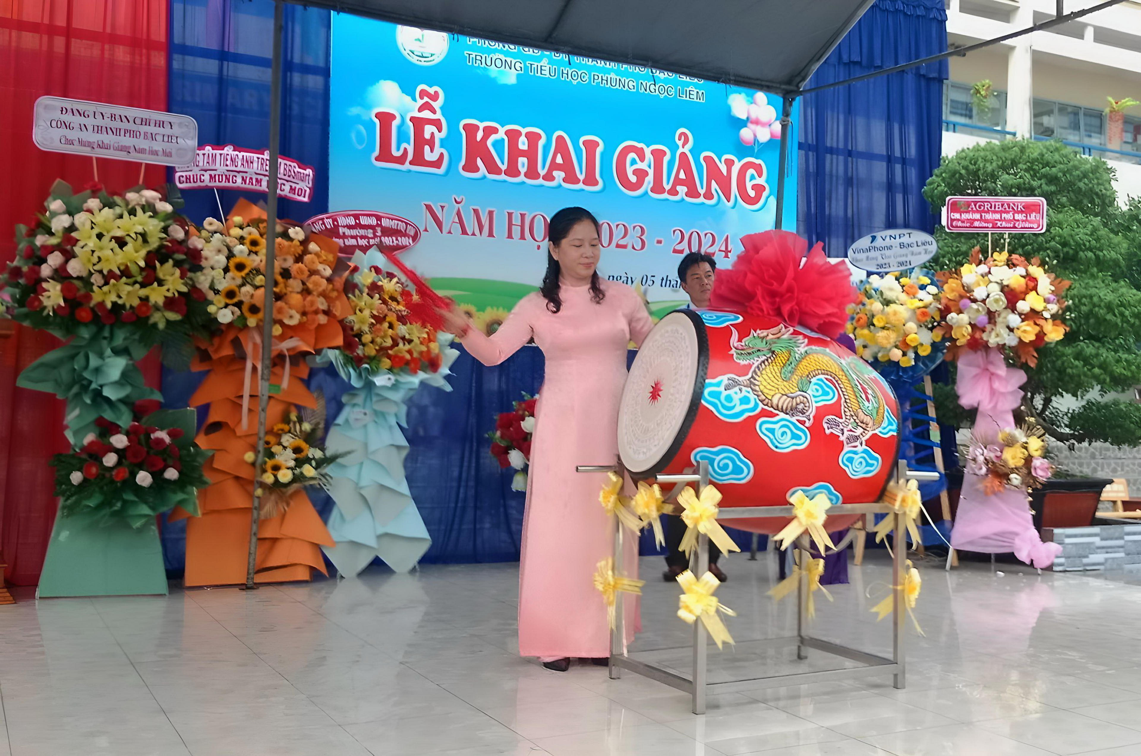 Cũng trên địa bàn TP Bạc Liêu, thầy và trò Trường Tiểu học Phùng Ngọc Liêm (phường 3) tổ chức lễ khai giảng ngắn gọn trong không khí trang nghiêm. Bà Lê Kim Thúy - Phó Bí thư Thành ủy, Chủ tịch UBND TP Bạc Liêu đánh trống khai giảng năm học mới tại trường này.