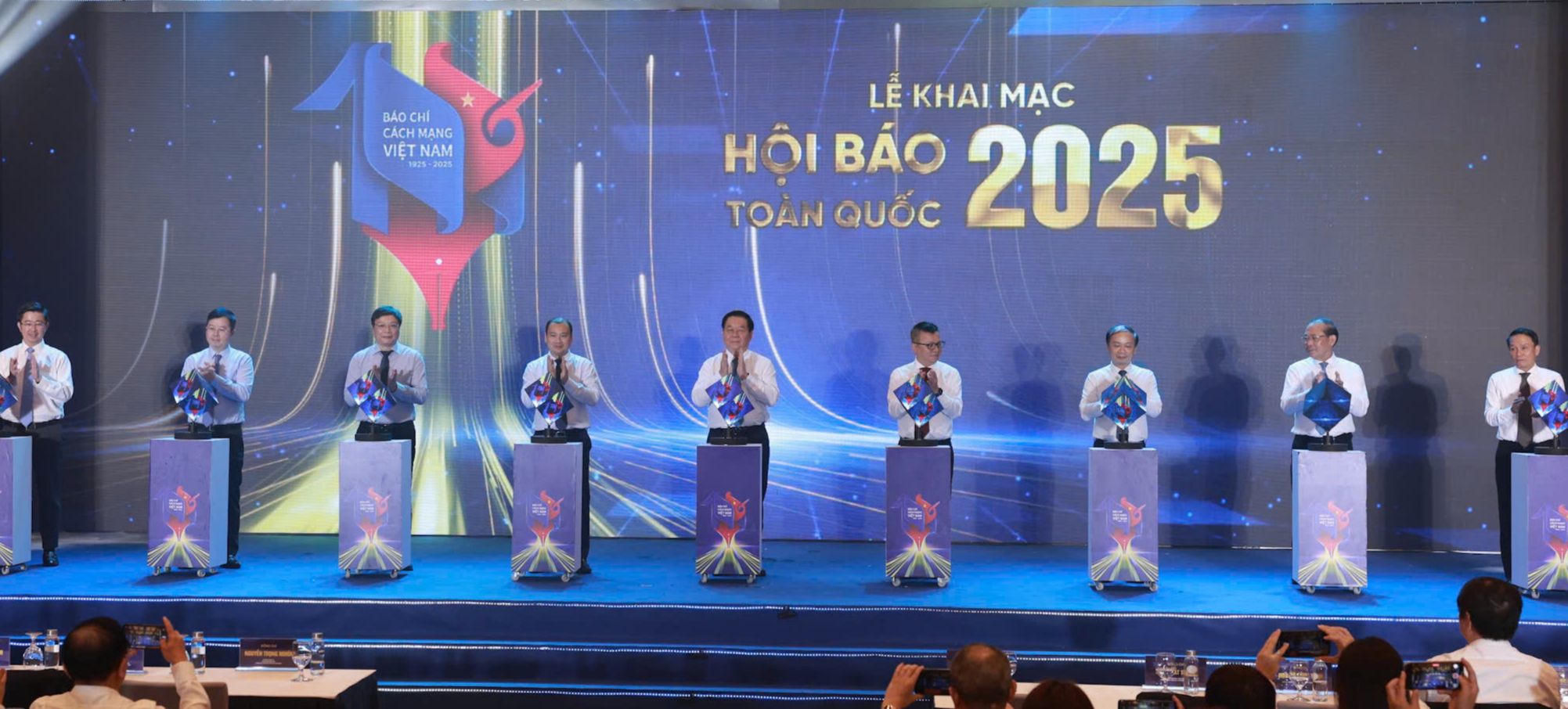 Các đại biểu ấn nút khai mạc Hội báo toàn quốc năm 2025. |