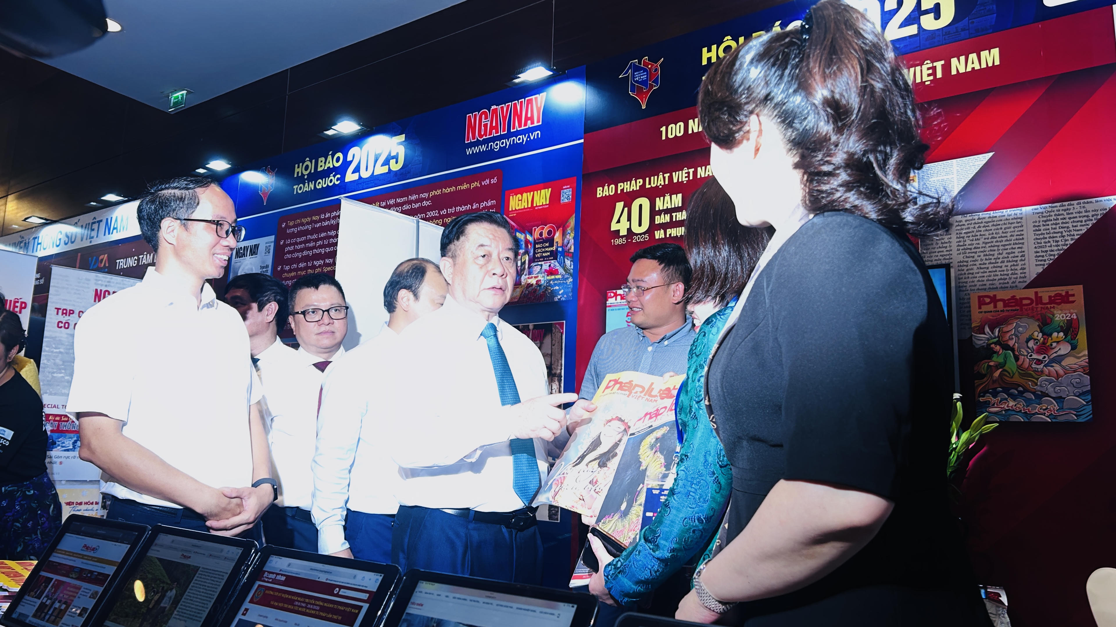 Ủy viên Bộ Chính trị, Bí thư Trung ương Đảng, Trưởng Ban Tuyên giáo và Dân vận Trung ương Nguyễn Trọng Nghĩa tham quan gian hàng Báo Pháp luật Việt Nam.