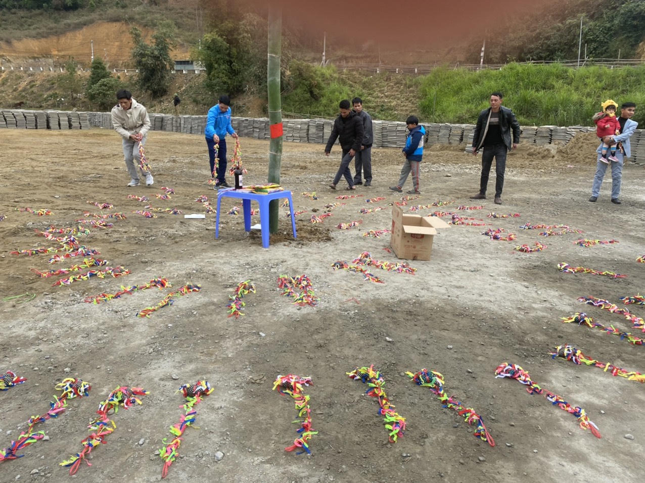Mở đầu phần lễ, những bậc cao niên trong thôn rải quả còn quanh cây nêu và thắp hương báo cáo thần linh, sau đó ném những quả còn đầu tiên để khai hội.