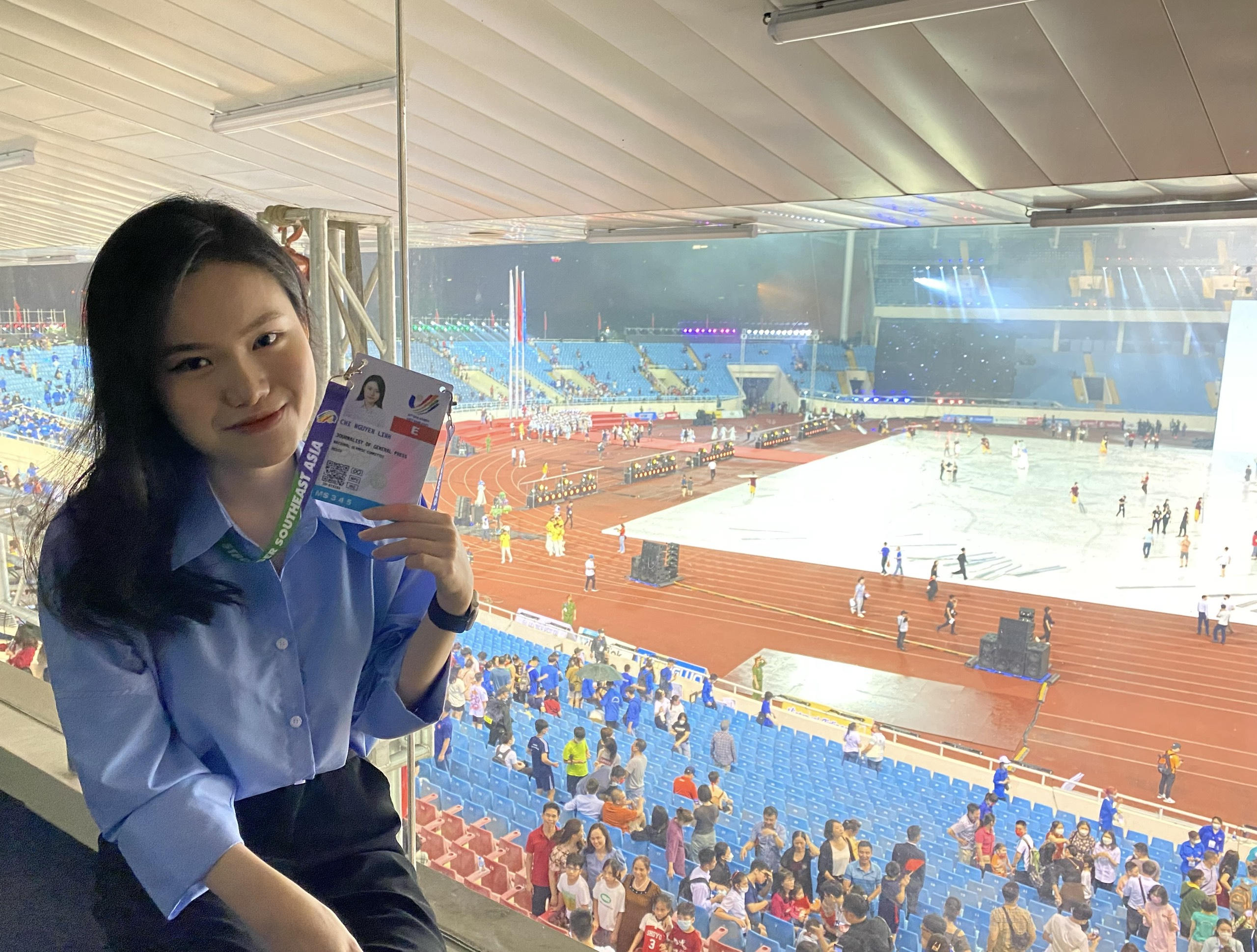 Phóng viên Linh Chi tác nghiệp tại SEA Games 31. |