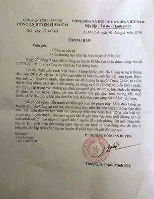 Trong văn bản này có nêu: "Công an huyện Simacai nhận được công văn số 1177/CAT-PV11 của Công an tỉnh thông báo: Tại địa phận giáp ranh Việt Nam và Trung Quốc tại Hà Giang trong 6 tháng đầu năm 2016 đã xảy ra nhiều vụ bắt cóc mổ lấy nội tạng."