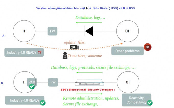 Theo một số chuyên gia an ninh mạng thì trong xu hướng cách mạng công nghệ 4.0 hiện nay, một số nước như Pháp, Đức, Anh, Hoa Kỳ.... đã thay thế Data diodes từ năm 2010 bằng giải pháp công nghệ khác tối ưu hơn là BSG (Bidirectional Security Gateways).