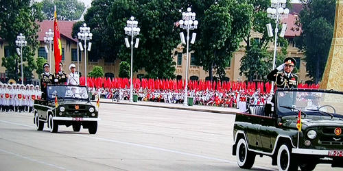 Trước đó, lúc 6h55', Đoàn lãnh đạo Đảng, Nhà nước đã tiến ra lễ đài, chuẩn bị cho lễ chào cờ bắt đầu lúc 7h5. Sau lễ chào cờ, Chủ tịch nước đọc diễn văn và đến 7h40 bắt đầu chương trình diễu binh diễu hành. Điều hành lễ diễu binh là trung tướng Nguyễn Quốc Khánh, Phó tổng tham mưu trưởng Quân đội nhân dân Việt Nam.