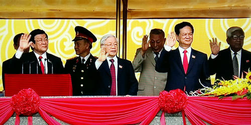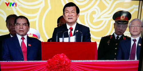Lúc 7h10', Chủ tịch nước Trương Tấn Sang đọc diễn văn khai mạc. Diễn văn ôn lại quá trình giành độc lập và thống nhất đất nước, thời kỳ đổi mới đất nước suốt 30 năm tiếp theo, nhấn mạnh: "Trong niềm tự hào và xúc động thiêng liêng, chúng ta thành kính tưởng nhớ Chủ tịch Hồ Chí Minh (...), Người đã dẫn dắt Đảng ta, Nhân dân ta (...) soi đường cho dân tộc ta đi tới tương lai".