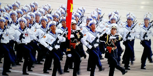 Tới 7h43', khối quân đội bắt đầu diễu binh qua lễ đài gồm: Cờ quyết thắng, khối quân nhạc, khối sỹ quan tham mưu, sỹ quan chính trị, sỹ quan hậu cần, sỹ quan kỹ thuật, phòng không không quân, nữ sỹ quan thông tin, sỹ quan lục quân, sỹ quan chính trị; khối học viện hậu cần, học viện kỹ thuật quân sự, học viện Phòng không Không quân, trường sỹ quan không quân, học viện hải quân, học viện biên phòng, trường sỹ quan đặc công, trường sỹ quan tăng thiết giáp, trường sỹ quan pháo binh, trường sỹ quan công binh, trường sỹ quan phòng hóa, trường sỹ quan thông tin...