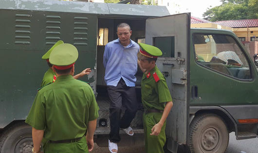 8h45p: Bị cáo Nguyễn Văn Kỳ được dẫn giải đến Trụ sở TAND TP Hà Nội trong xe chuyên dụng của lực lượng cảnh sát hỗ trợ Tư pháp.