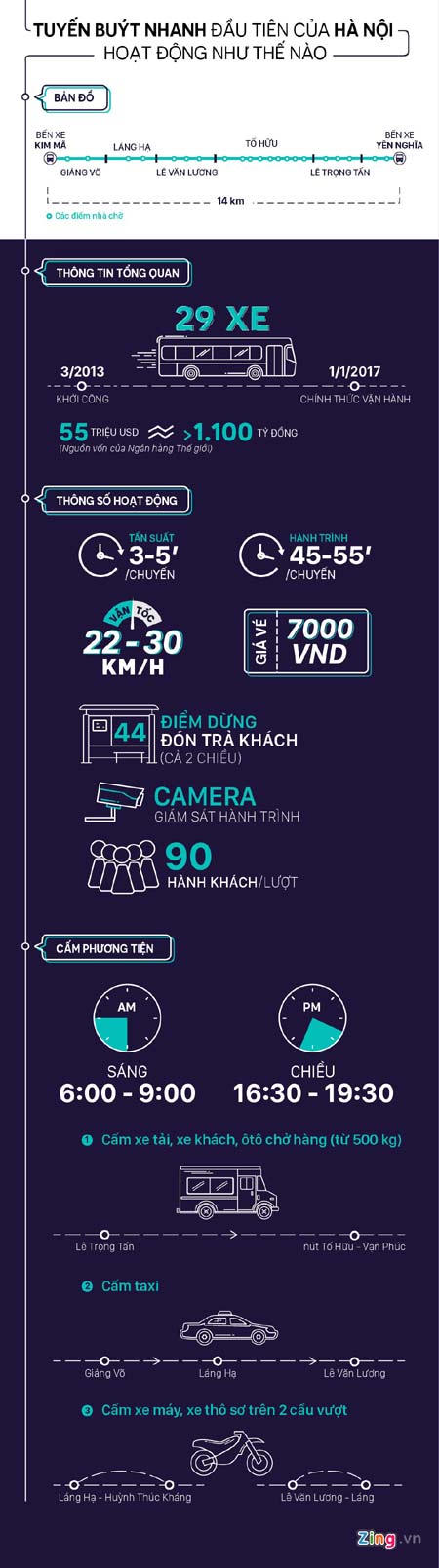 Tuyến buýt nhanh Hà Nội hoạt động thế nào? Từ ngày 1/1/2017, nhiều phương tiện, tuyến đường ở Hà Nội sẽ bị cấm để ưu tiên tối đa cho tuyến buýt nhanh Yên Nghĩa - Kim Mã hoạt động. Thứ Năm 22/12/2016 09:17 (GMT+7) Mô tả ảnh
