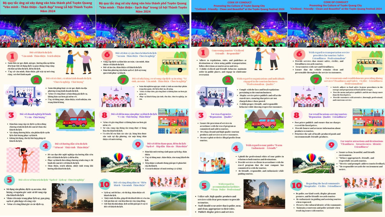 Nhằm mang đến cho du khách những ấn tượng tốt đẹp, UBND TP. Tuyên Quang vừa ban hành bộ quy tắc ứng xử xây dựng văn hóa thành phố Tuyên Quang “văn minh - thân thiện - sạch đẹp” trong Lễ hội Thành Tuyên năm 2024.