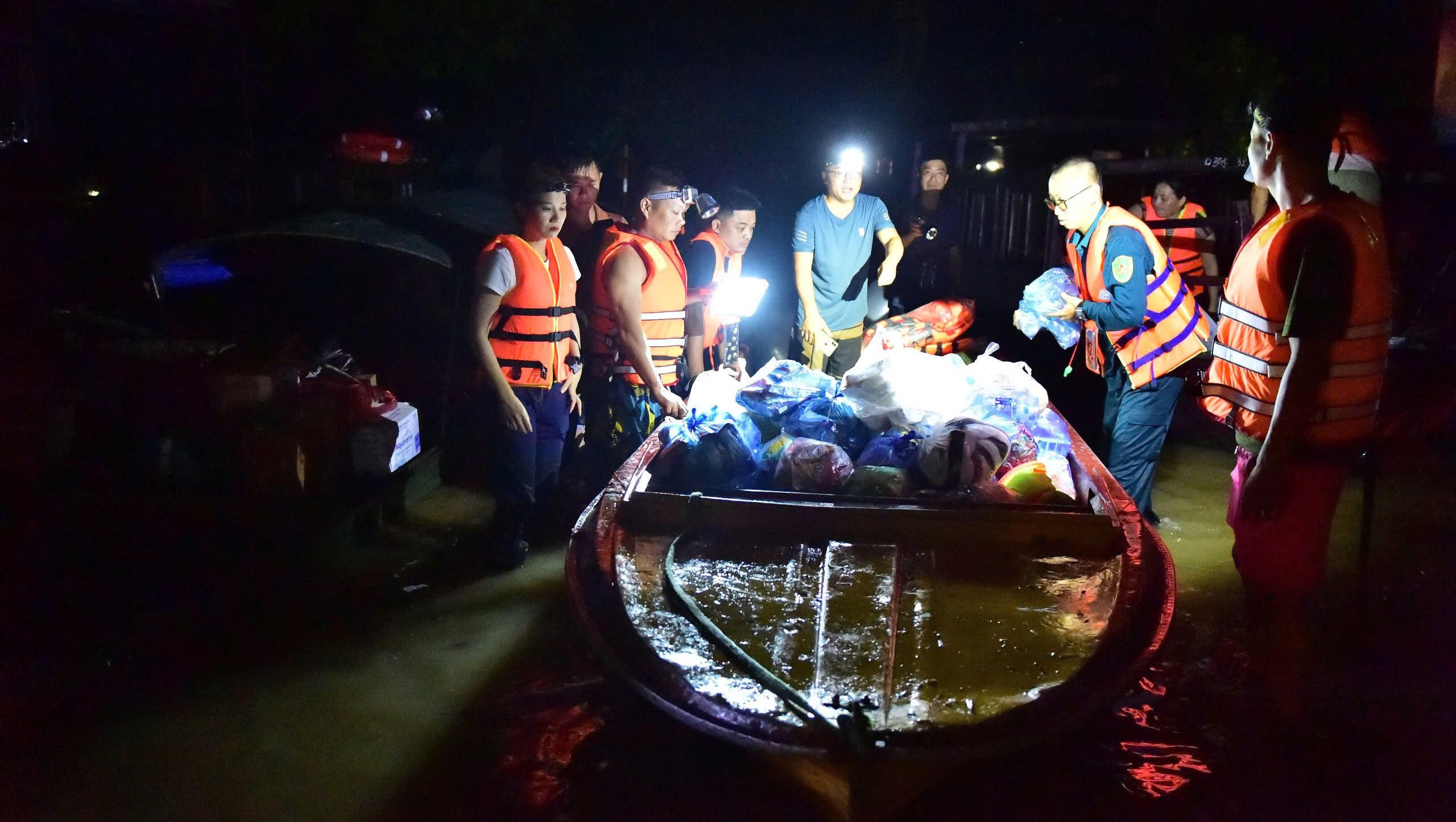 Đường phố ngập sâu, lực lượng chức năng phải dùng thuyền vận chuyển nhu yếu phẩm. (Ảnh: Dương Phúc) |