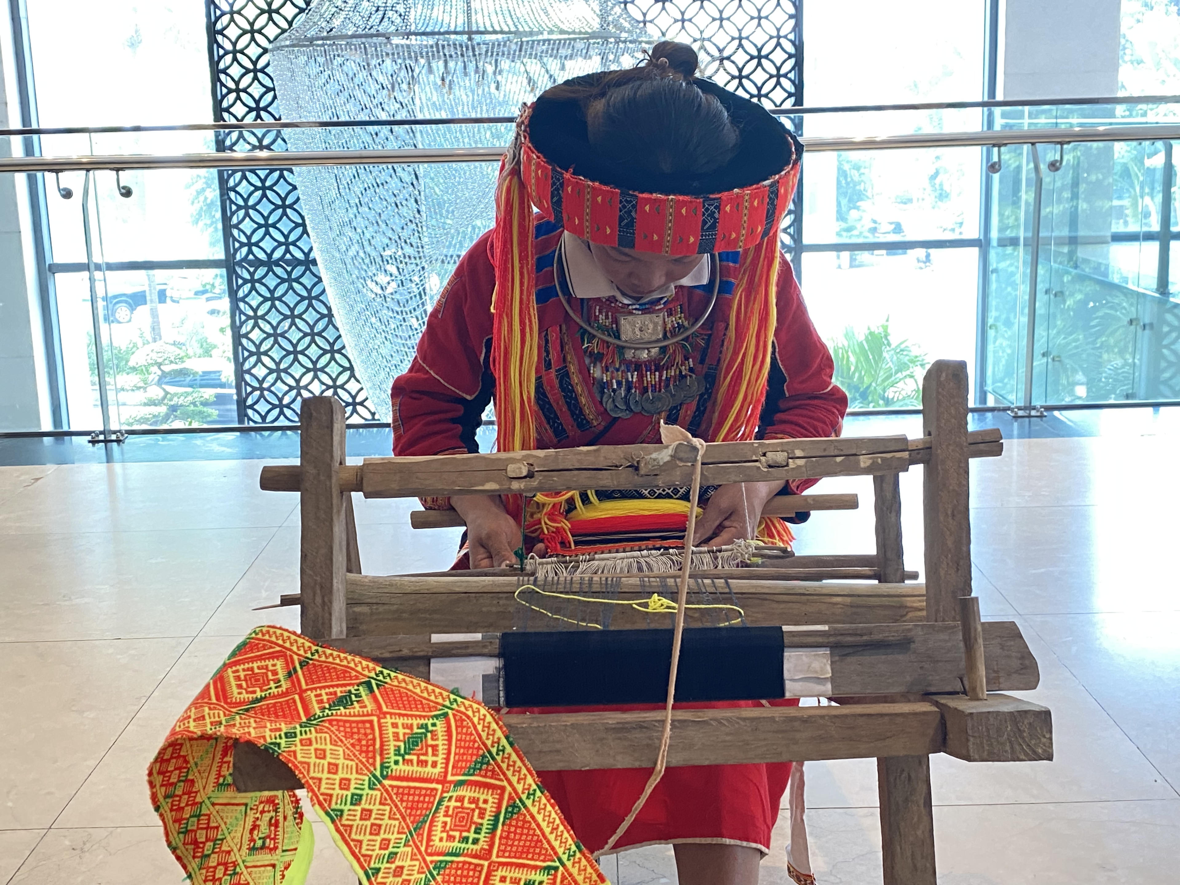 Người phụ nữ dân tộc Pà Thẻn đang dệt vải bên khung củi (Ảnh: Lê Hanh) |