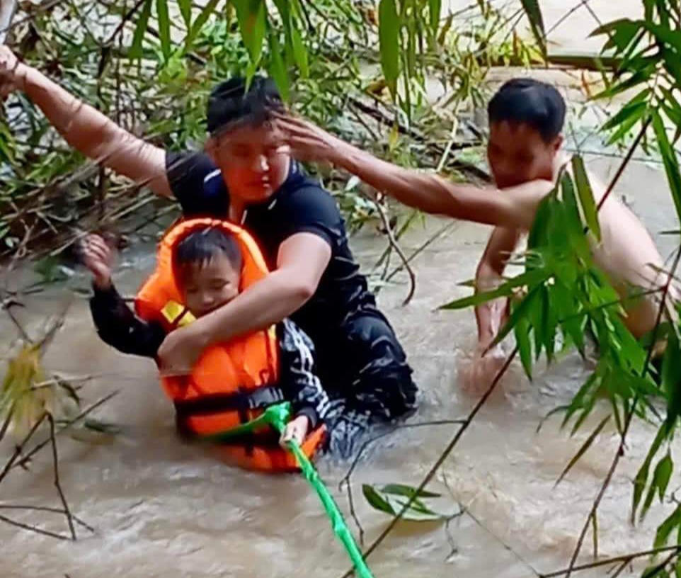 Giây phút cứu sống cháu B giữa dòng lũ dữ. Ảnh: CTV |