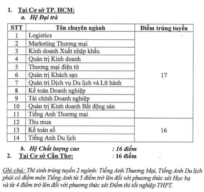 Còn tại cơ sở Cần Thơ, điểm chuẩn tất cả các ngành là 16. Cụ thể như sau: