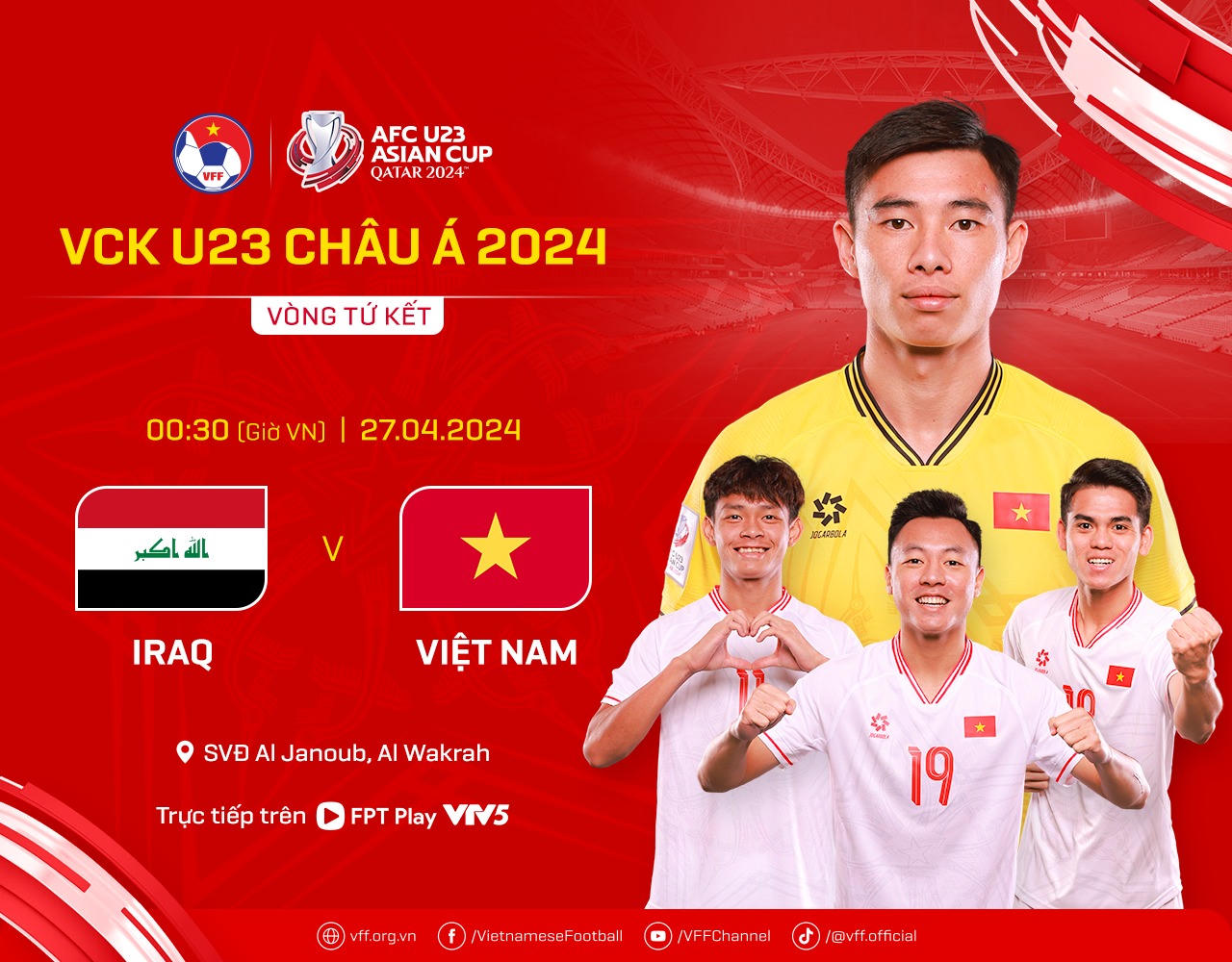 Trận tứ kết giữa đội tuyển U23 Việt Nam và U23 Iraq sẽ diễn ra trên SVĐ Al Janoub vào 20h30 ngày 26/4 theo giờ địa phương (0h30 ngày 27/4 theo giờ Việt Nam).