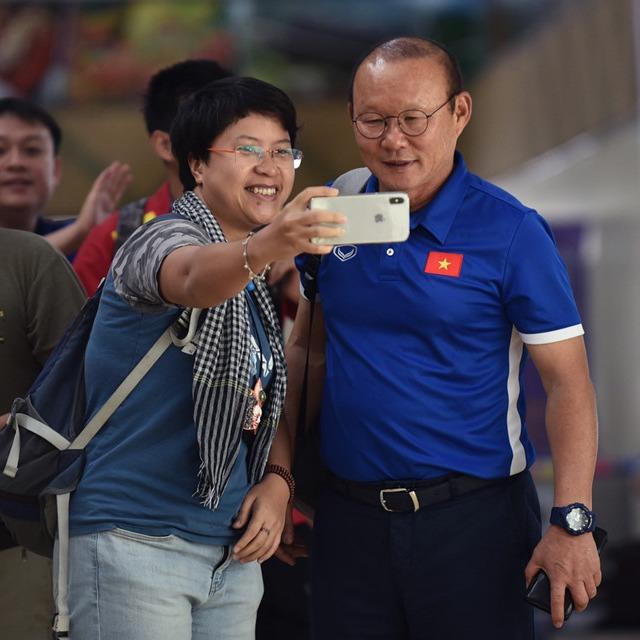 Mặc dù trời mưa nặng hạt, phải che ô chạy lên máy bay nhưng thầy trò tuyển Việt Nam vẫn vui vẻ chụp ảnh cùng người hâm mộ.