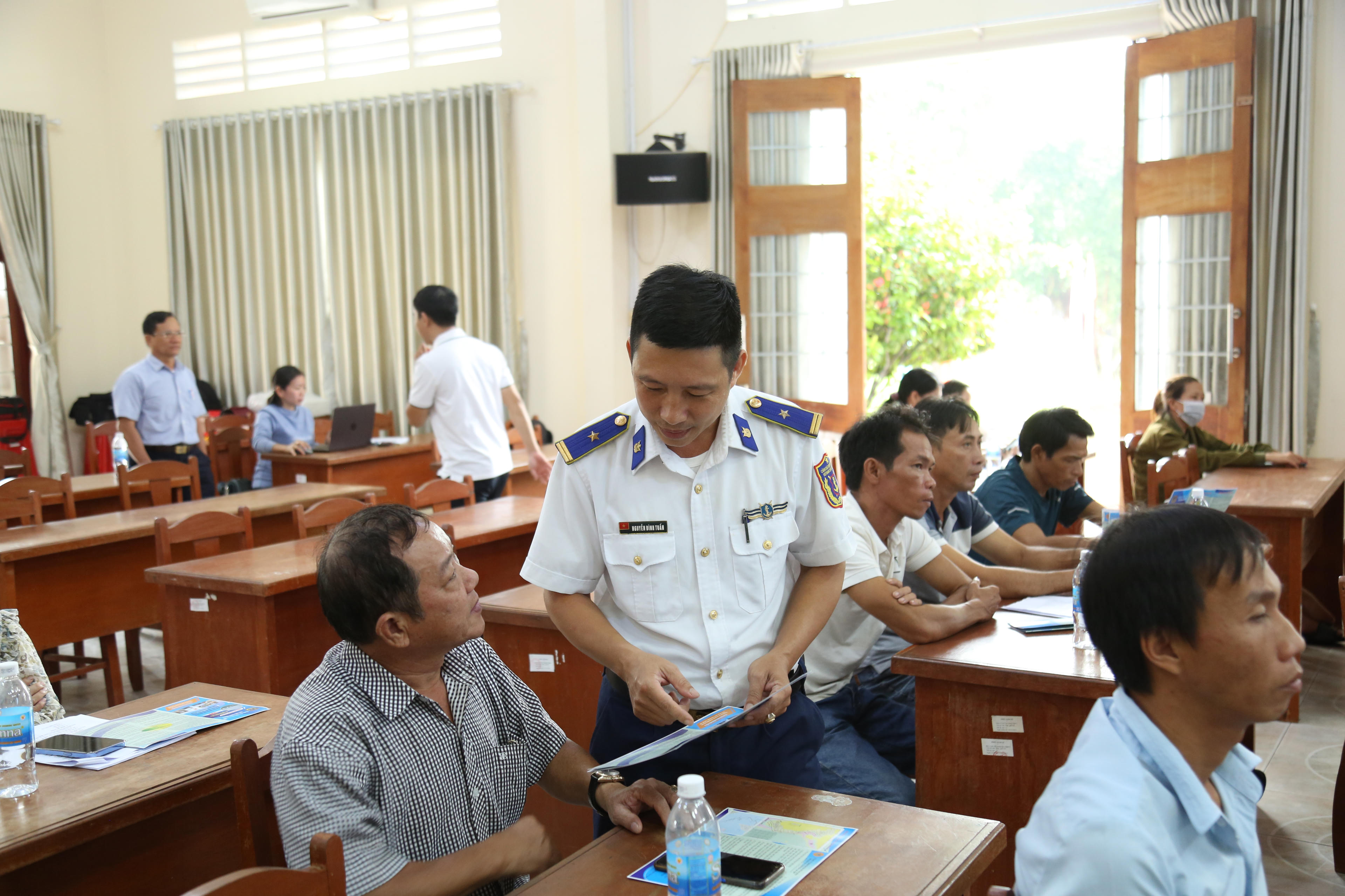 Tuyên truyền viên phát tờ rơi và tuyên truyền đến từng ngư dân |