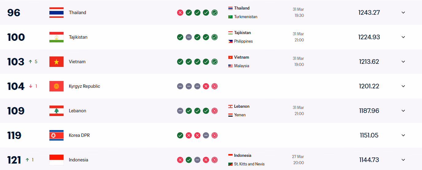 Theo cập nhật mới nhất của FIFA, đội tuyển Việt Nam đã vươn lên vị trí thứ 103 thế giới, xếp thứ 18 châu Á.