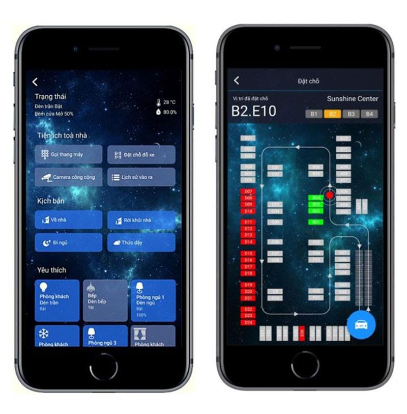 Các tiện ích dành cho cư dân điện tử: ứng dụng điều khiển nhà thông minh (trái) và giao diện chỉ đường của bãi đỗ xe thông minh (phải).