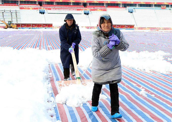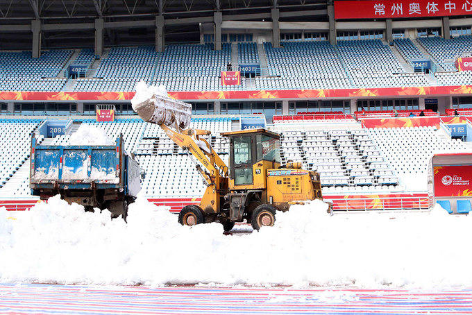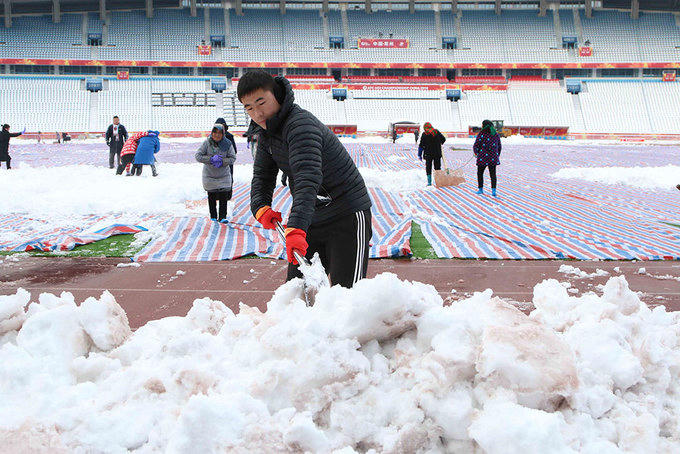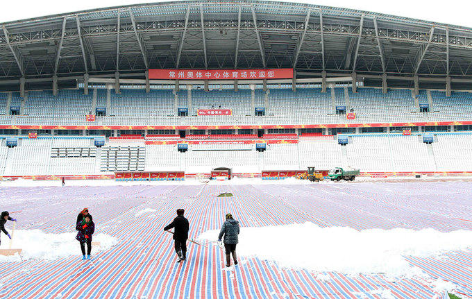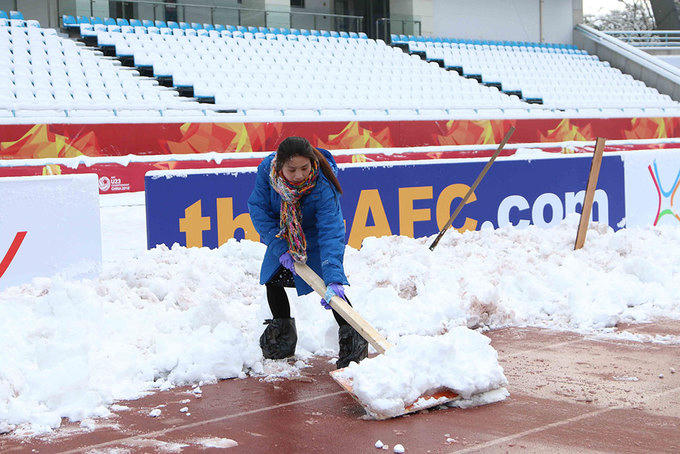 Sau nhiều ngày phủ dày đặc mặt sân Olympic Thường Châu, sáng nay 26/1, tuyết đã ngừng rơi. Công việc dọn dẹp lập tức được triển khai.
