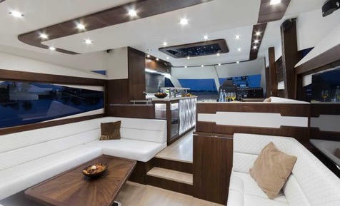 Những du khách ưa thích sưởi nắng thì boong tàu lát gỗ cao cấp sẽ là nơi thực sự lý tưởng. Nội thất du thuyền sang trọng với chất liệu cao cấp và đạt đến độ hoàn hảo. Trong đó, khoang chính ở bên trên khá rộng, đến mức có thể trải nghiệm một đường golf nhỏ. Đây là khu vực gồm vị trí lái chính, quầy ăn tối và giải trí. Bên dưới là 4 khoang cabin và 3 phòng tắm lớn.