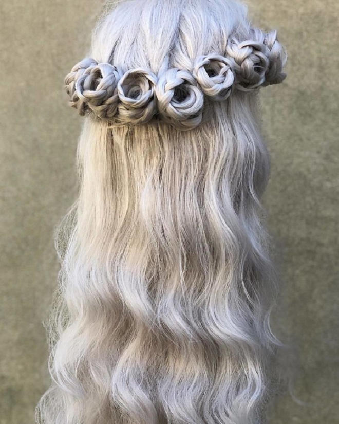 (PLO) - Chuyên gia tạo kiểu tóc Alison Valsamis tiết lộ cô mất khoảng 1 giờ để tạo kiểu tóc tết mô phỏng bông hoa hồng.