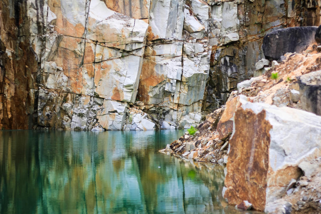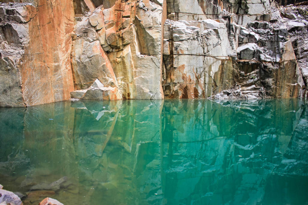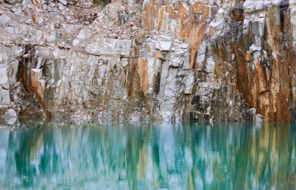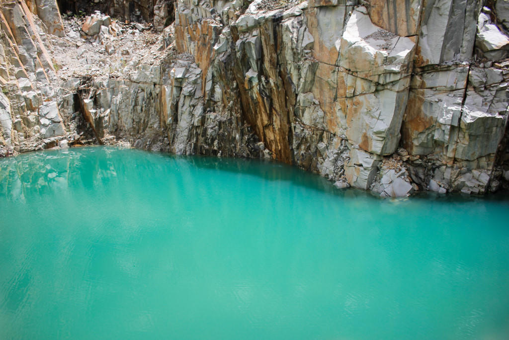 Giữa núi rừng hoang sơ, bên những vách núi đá nhiều màu sắc, một hồ nước trong vắt có màu xanh ngọc bích hiện lên in bóng mây trời.