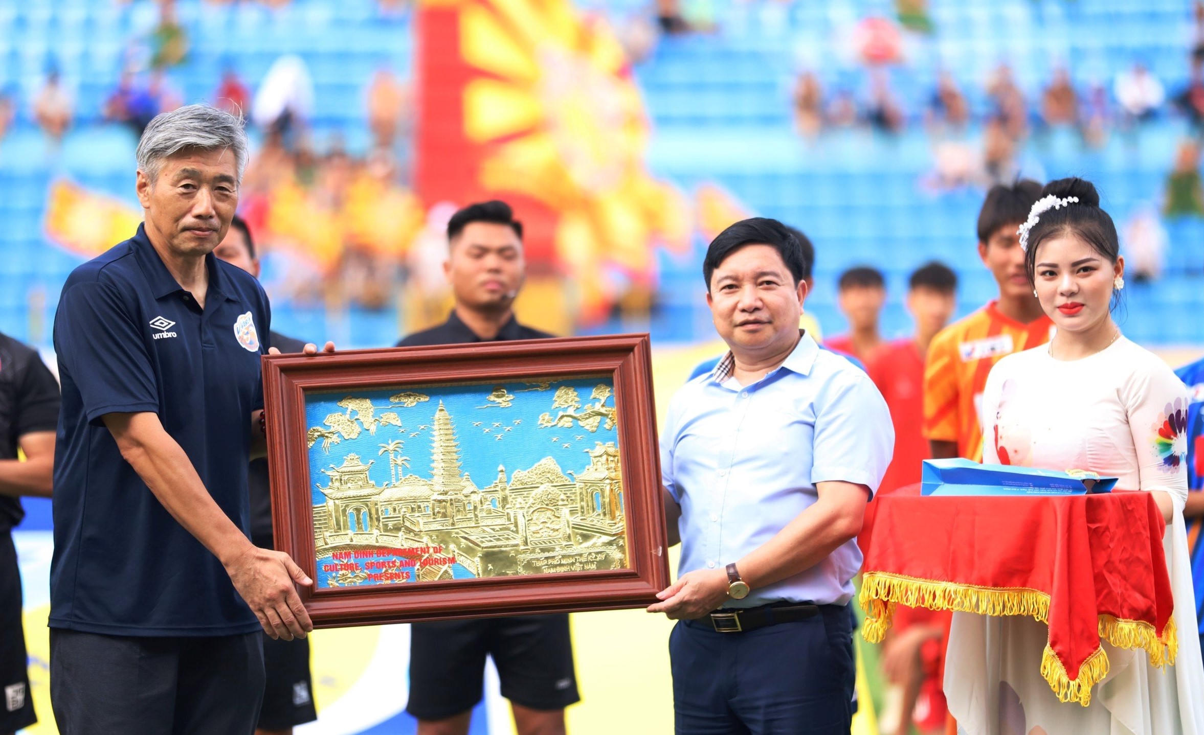 Ông Nguyễn Tiến Dũng (ảnh trái) - Giám đốc Sở VHTTDL tỉnh Nam Định tặng bức tranh lưu niệm cho đại diện đội U15 V.Varen Nagasaki |