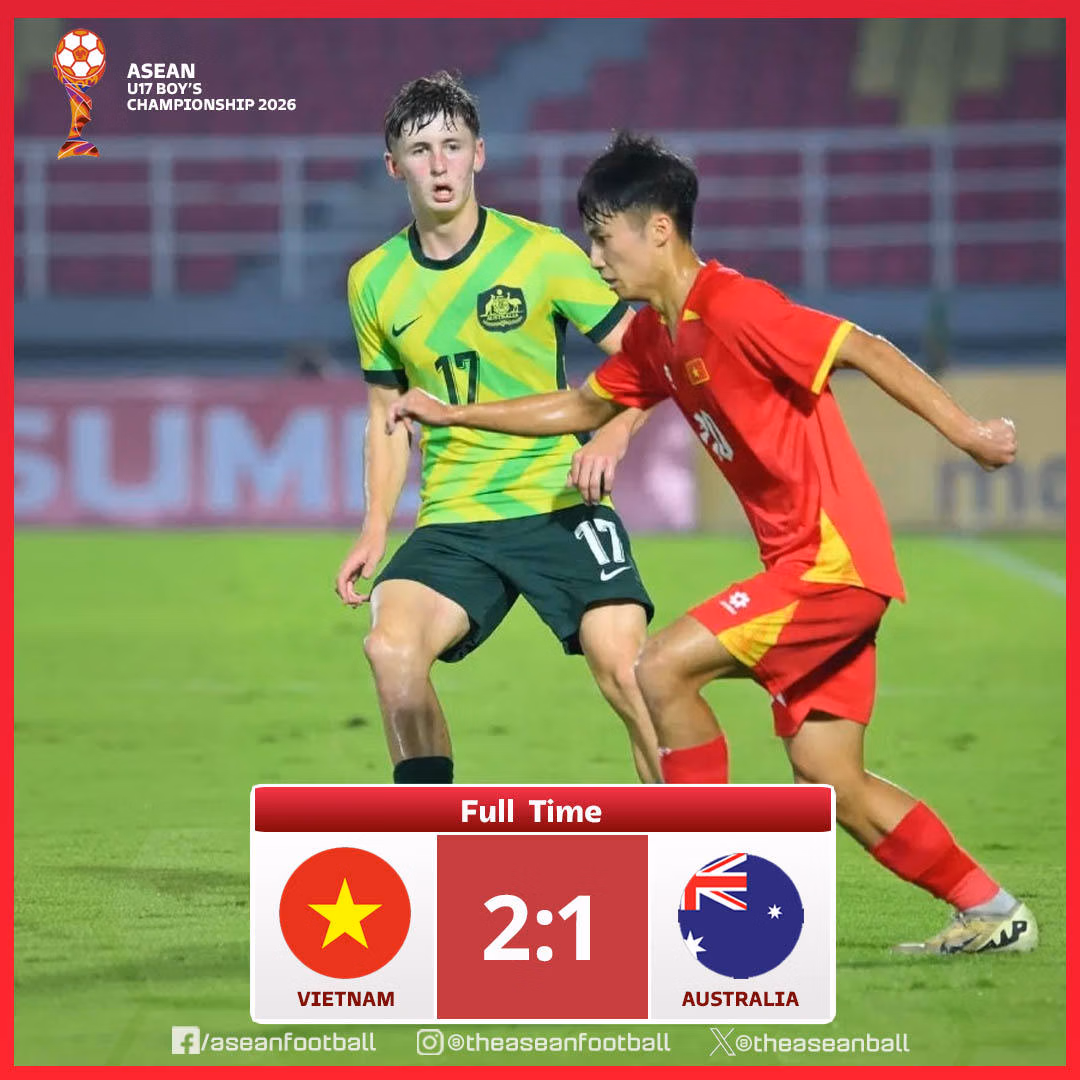 U17 Việt Nam thắng U17 Australia 2-1 giành vé vào chung kết giải U17 Đông Nam Á 2026.